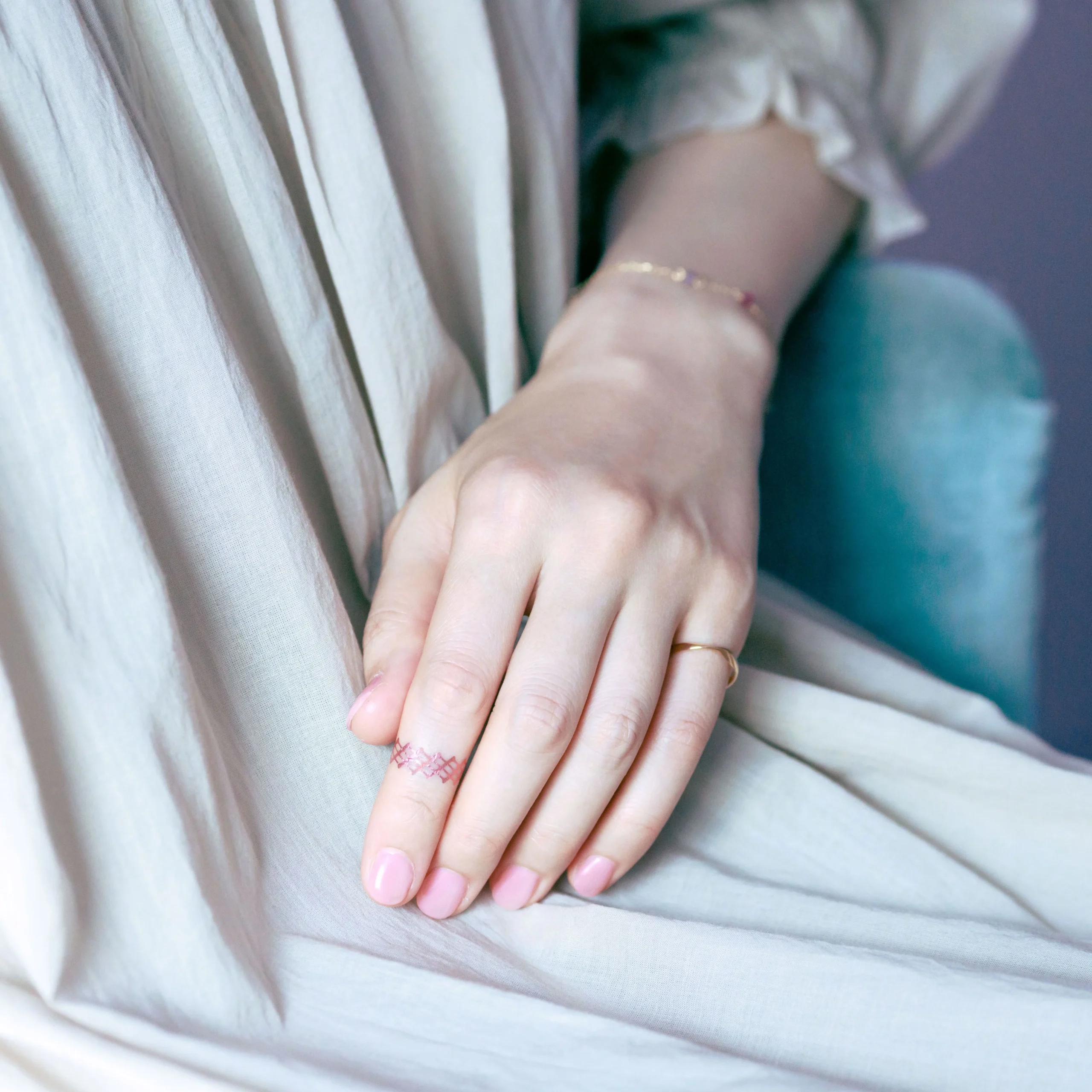 - 約3分間乾燥させてください。3〜5日程度お楽しみ頂けます(個人差がございます)。落とす場合にはアルコールやベビーオイルでやさしく拭き取ります。
